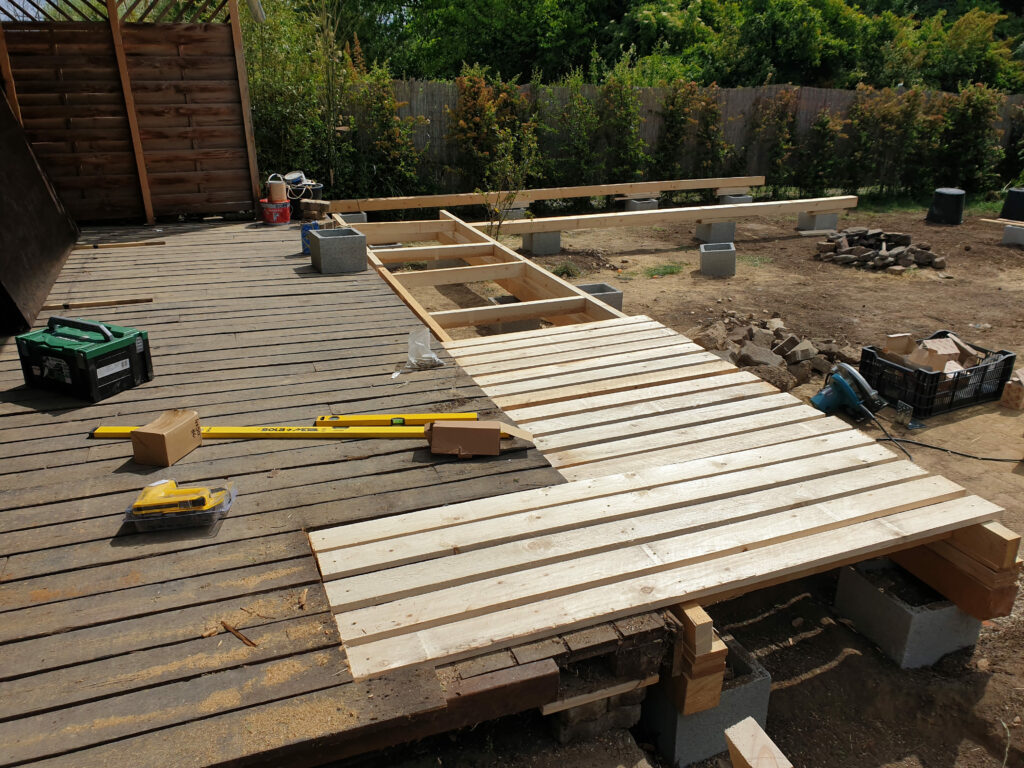 A gerendákat elhelyeztük, közéjük lécekkel megépítettük a tartó szerkezetet, amit hajópadlóval befedtünk.